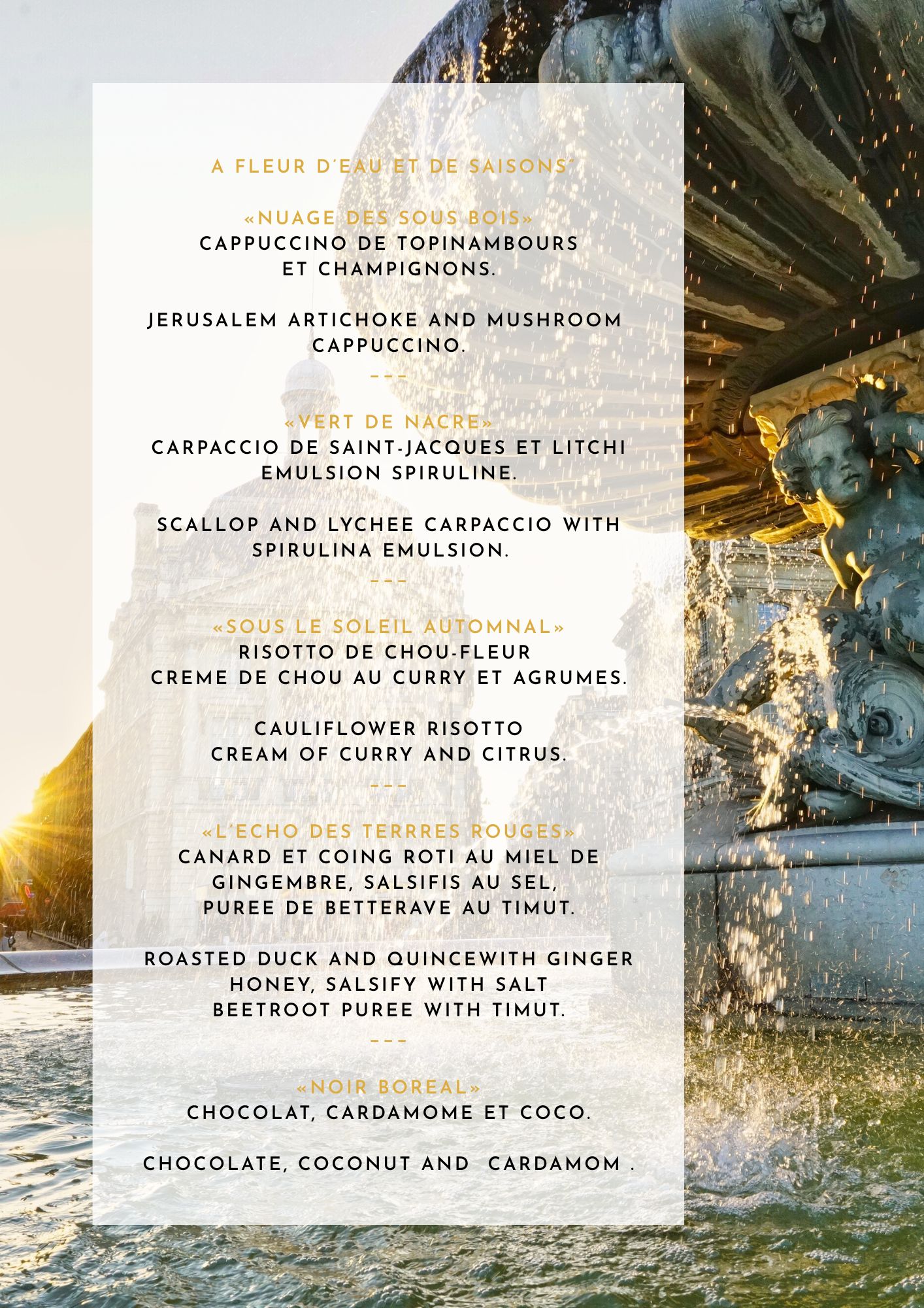 Pour toutes modifications de menu, veuillez le signaler lors de votre réservation sur le site internet.